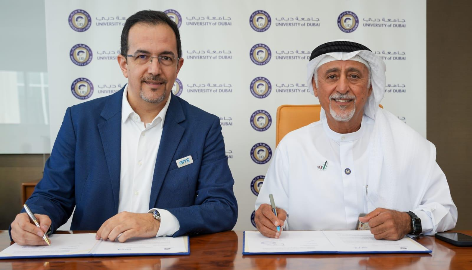 The agreement was signed by Dr. Eesa Bastaki, President of the University of Dubai, and Mo Mobasseri, Chief Executive Officer of emt, during a ceremony held in Dubai.